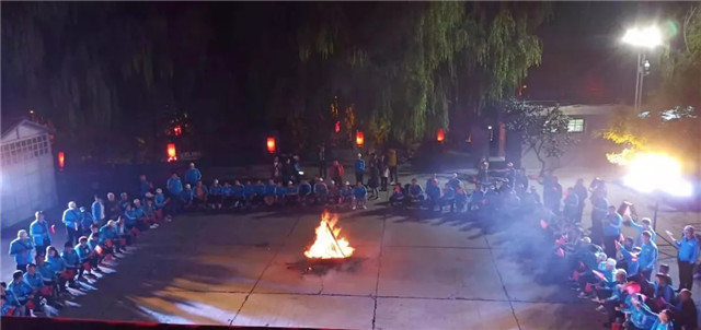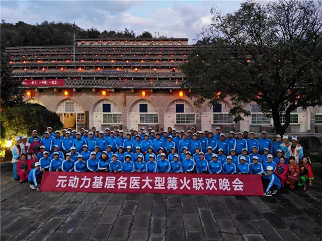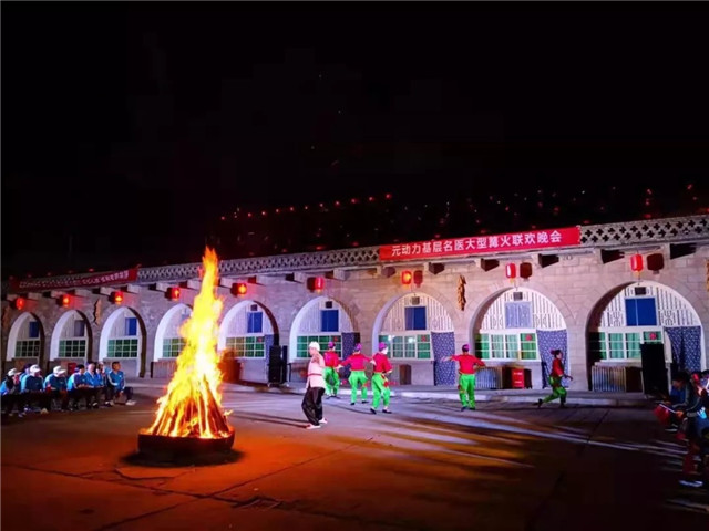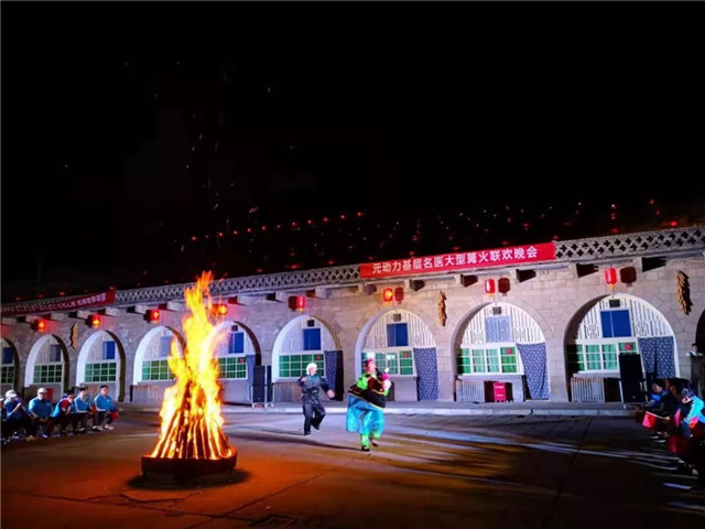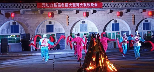 在世界最大的窑洞群宾馆脚下,火舞当空,元动力名医围坐在一起共赏陕北特色演出,欢声笑语,载歌载舞,热闹非凡。